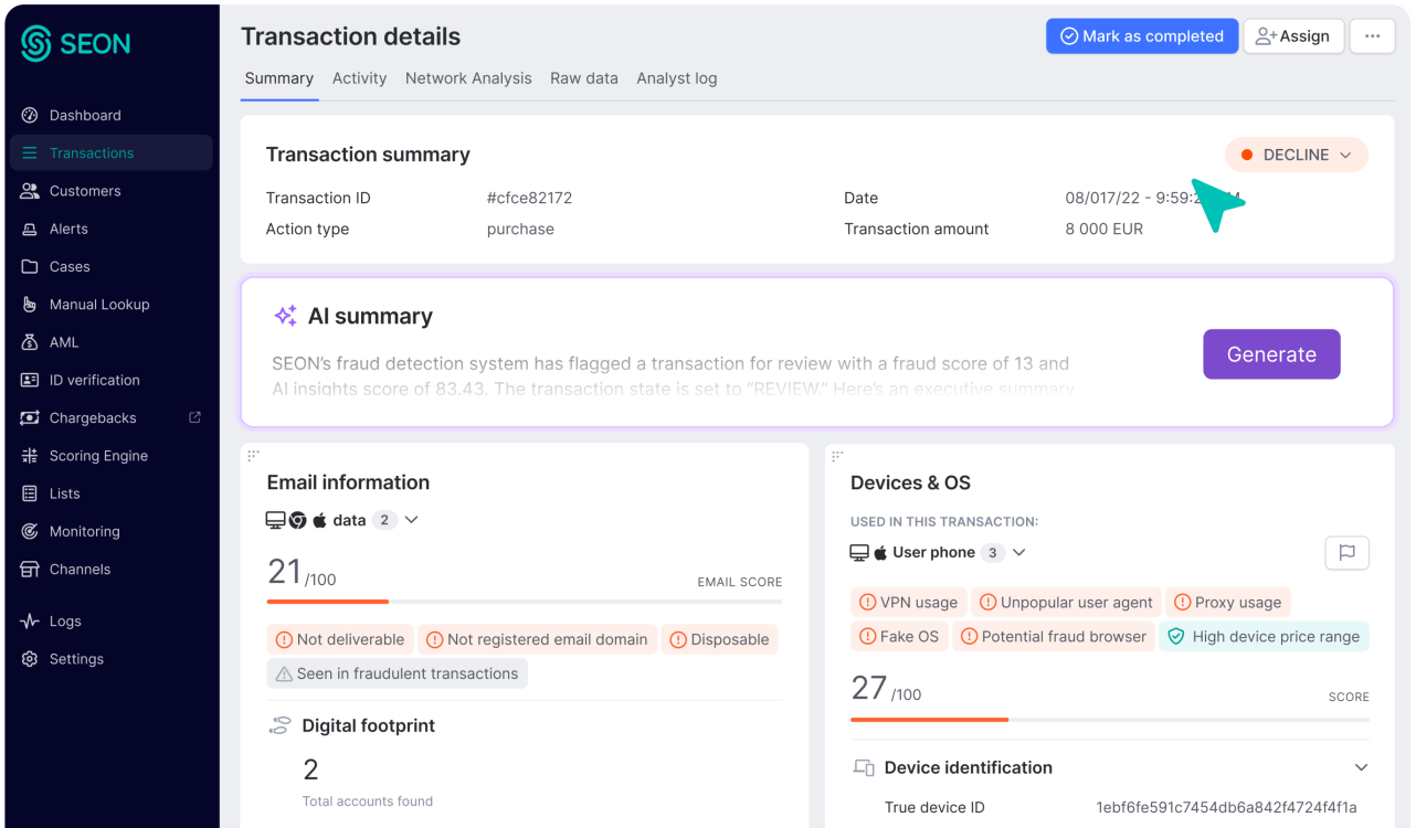 SEON connects 900+ first-party data signals to show you what other solutions can’t. Enrich data, understand context and take action from one place.