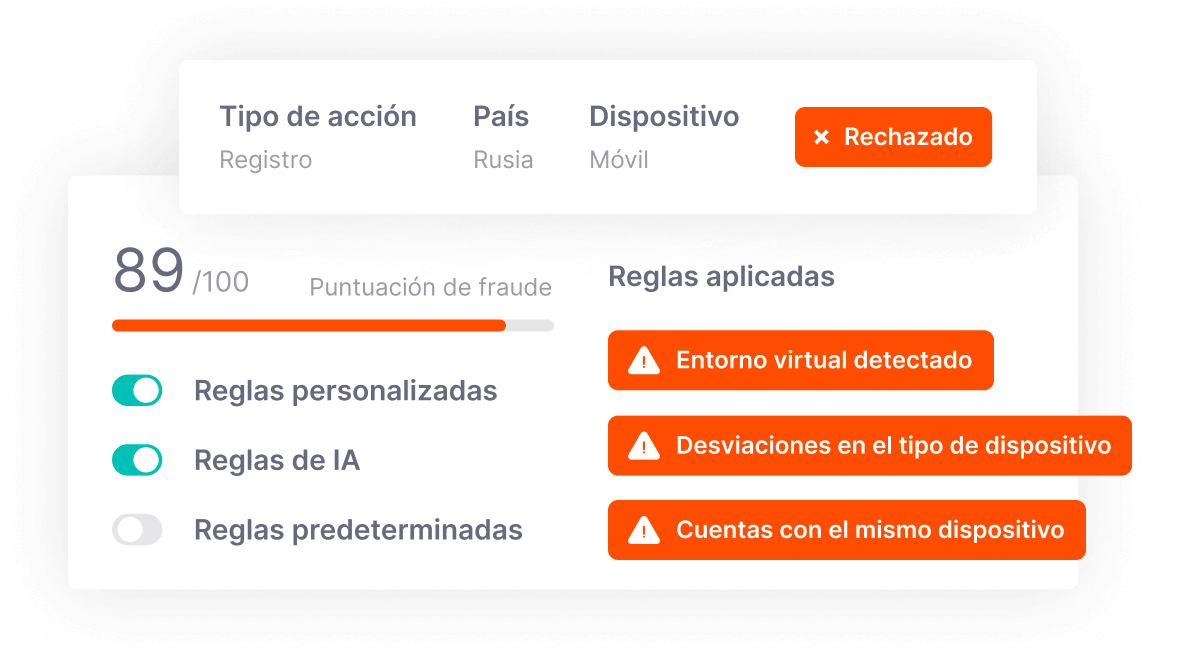 La puntuación transparente muestra qué indicadores impulsan cada decisión y facilita su auditoría. La automatización mejora cuando el aprendizaje automático y las reglas personalizadas se alinean con tu estrategia de riesgo, mientras las conexiones entre identidades y dispositivos dan a los analistas el contexto para resolver casos más rápido.