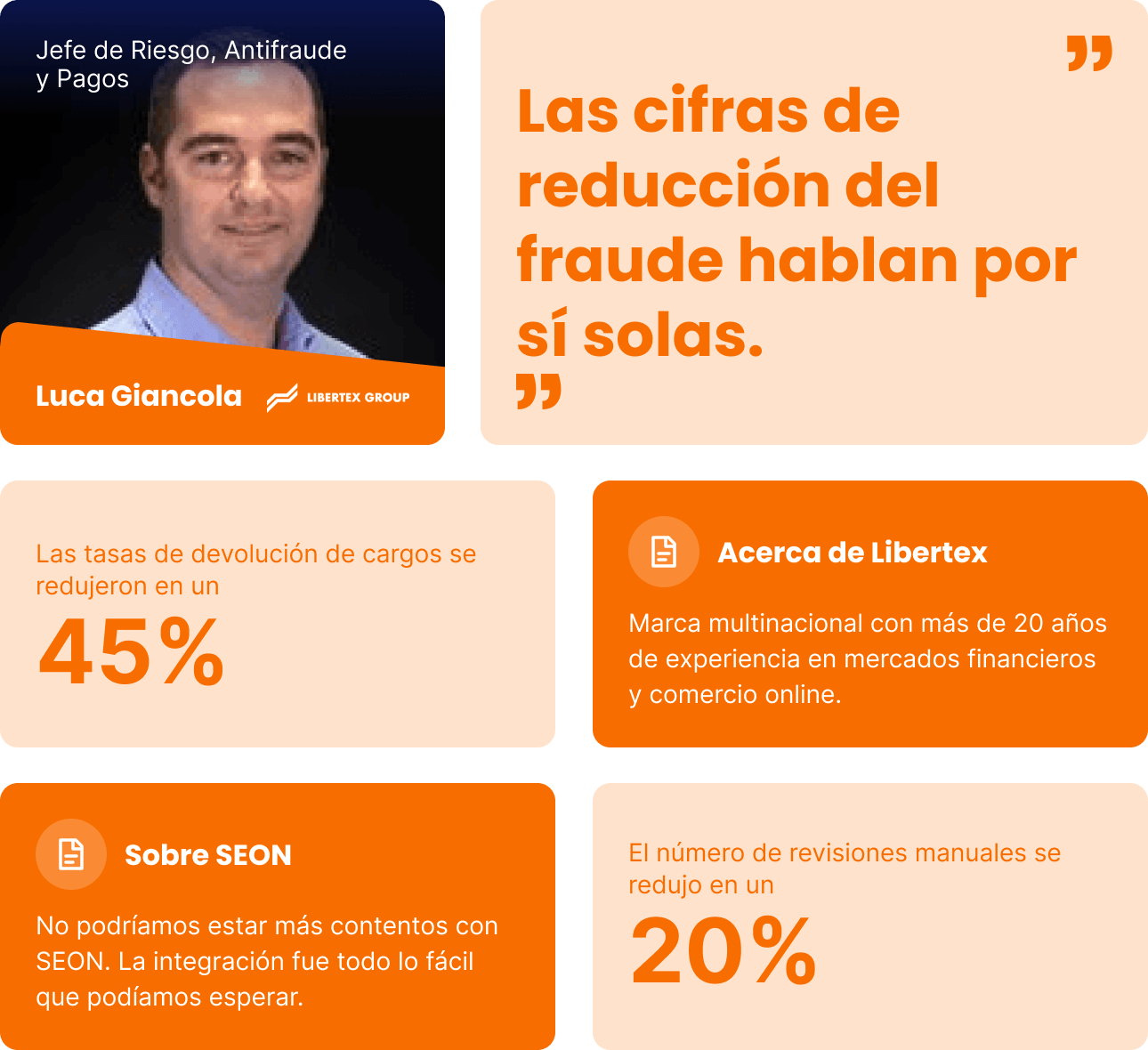 «Ya utilizábamos una herramienta de detección de fraude para la toma de huellas de los dispositivos», afirma Luca Giancola, responsable de riesgos, antifraude y pagos de Libertex Group. «Pero trabajamos con un pequeño número de puntos de datos, lo que suponía un montón de revisiones manuales y una presión constante sobre el equipo de fraude. Algunos de nuestros clientes tenían que esperar las revisiones para utilizar nuestra plataforma, algo que no queremos hacerles pasar».
