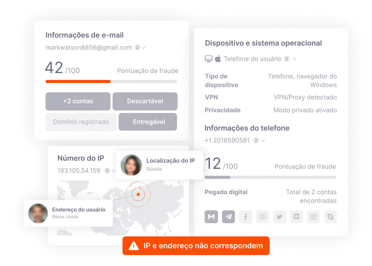 Pontua os sinais de risco (e-mail, telefone, IP) antes das verificações completas de KYC, permitindo a detecção precoce de fraudes e otimizando os custos de compliance.