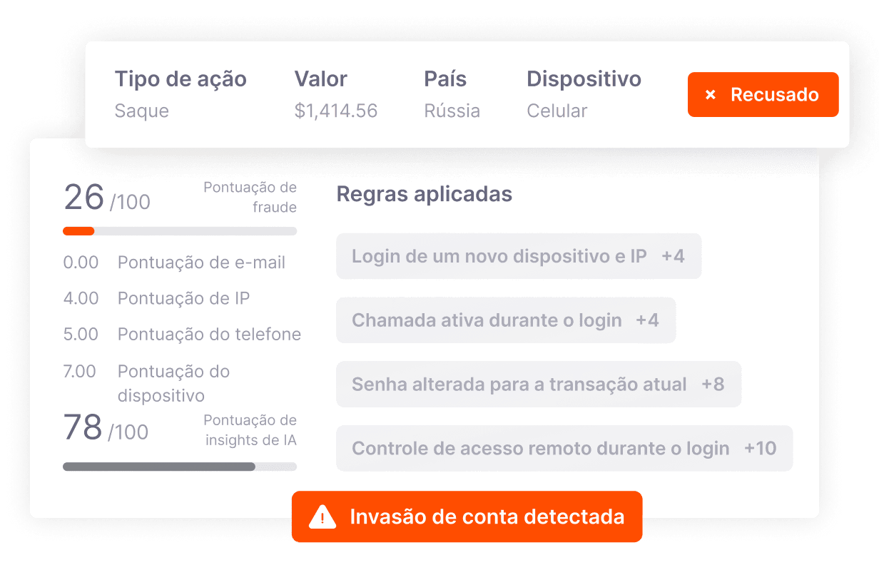 Monitore continuamente logins, alterações de contas e transações com IA. Use sinais de biometria comportamental, como copiar/colar em senhas, digitação irregular e movimentos incomuns do cursor para detectar fraudes e ataques de bots.