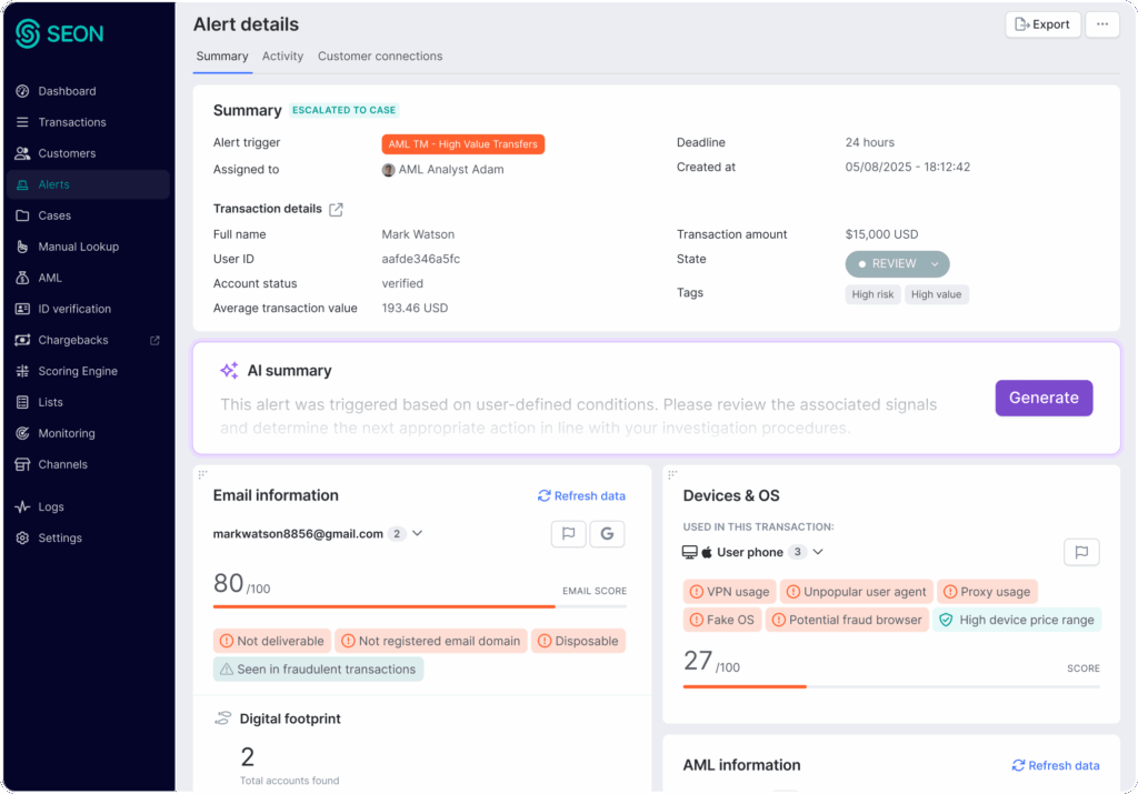 SEON uses AI to auto-generate SAR narratives and regulatory report form information based on alert and case activity, reducing manual effort and ensuring consistency.