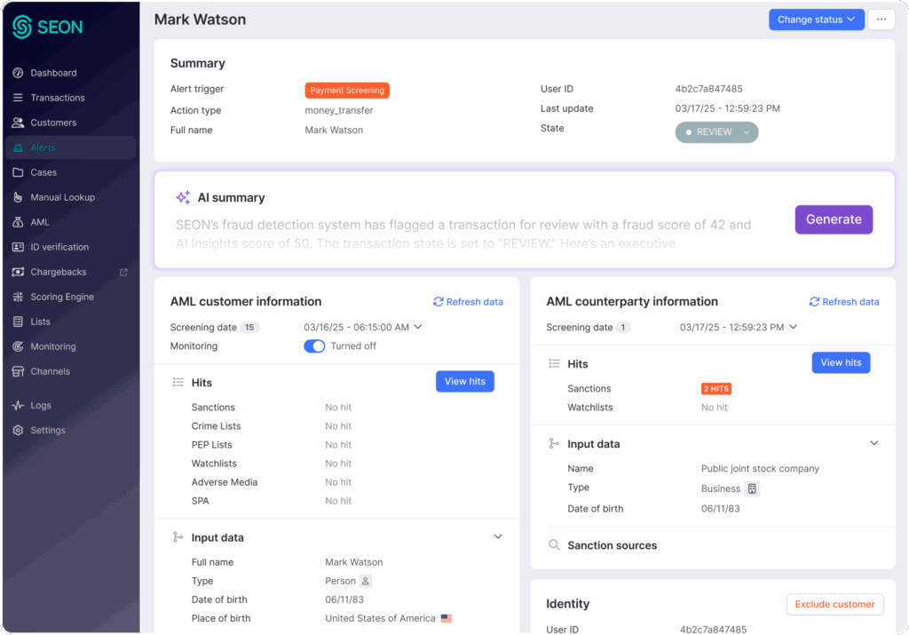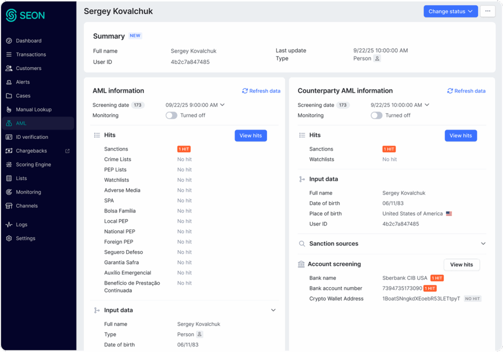 SEON’s alert trigger engine uses granular detection logic, allowing you to fine-tune how matches are flagged. You can select exact lists to screen transactions against and configure fuzzy matching to avoid noise, surfacing only the high-risk transactions that actually need review. You can also read more on how to reduce false positives in AML here.