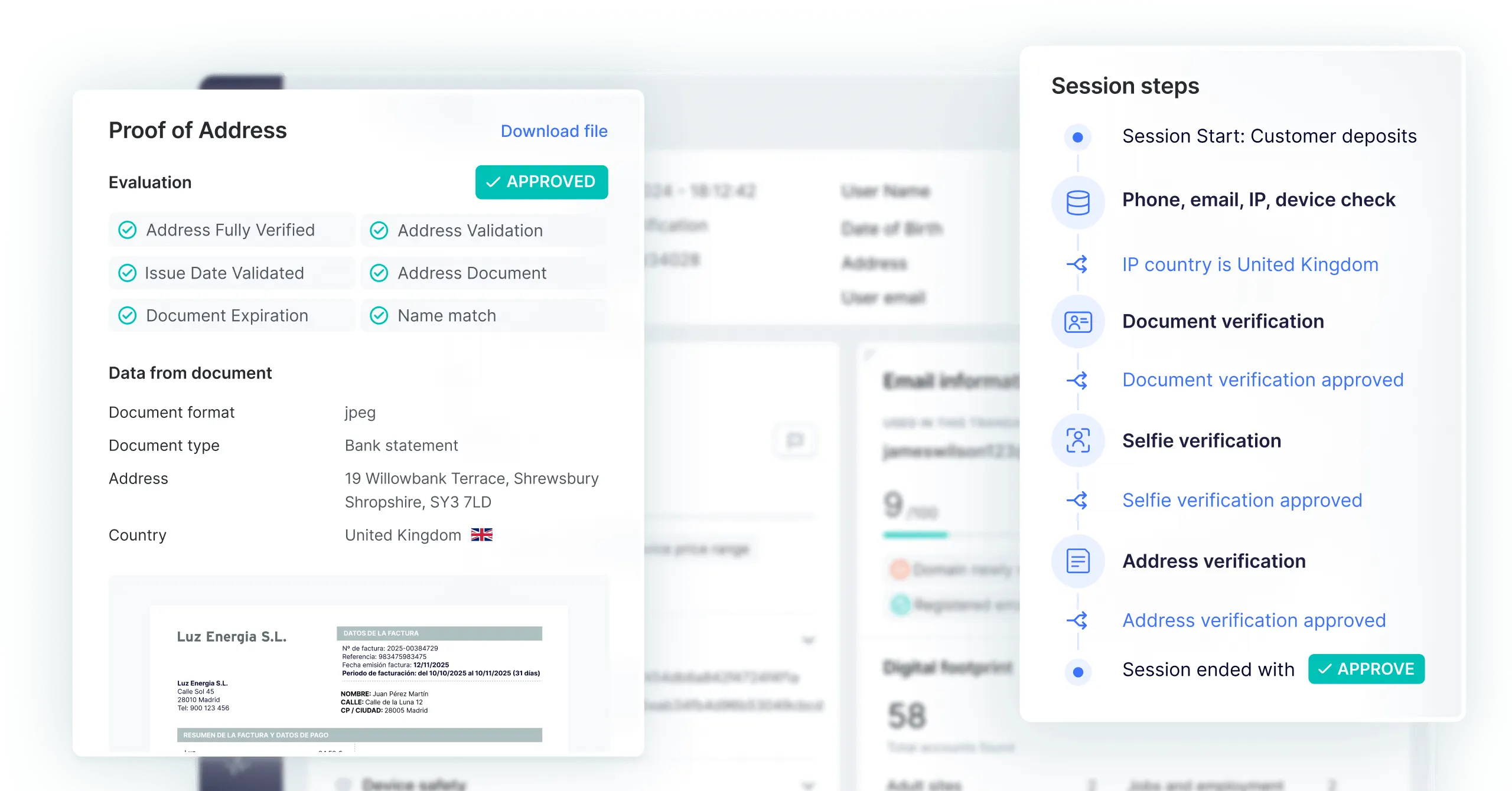 Verify address documents instantly with AI-powered analysis that catches AI-generated forgeries while extracting and cross-referencing address data with fraud signals.