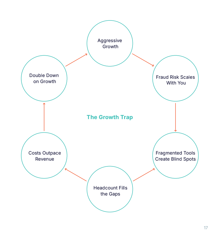 Over time, the pattern gets more entrenched: ambitious growth creates more fraud, fragmented tools miss signals, hiring more people masks the strain just long enough to fuel the next round of growth — and the cycle repeats at a higher cost base each time.